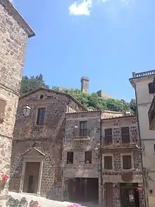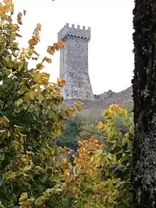 The main landmark of Radicofani is its Rocca (Castle), of Carolingian origin, documented since 978 as the Castle of Ghino di Tacco. Occupying the highest point of a hill, at 896 metres (2,940 ft), it was restored after the conquest from the Grand Duchy of Tuscany (1560–67). It has two lines of walls: the external one has a pentagonal shape, while the inner one is triangular, with three ruined towers at each corner and a cassero (donjon) which can be visited.