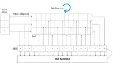 The designers call RadioGatún an "ideal mangling function". RadioGatún uses a "belt" and "mill" to cryptographically process binary data, with the majority of mangling operations performed on the "mill" part of RadioGatún.[8]