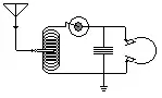 A crystal set receiver consisting of an antenna, a variable inductor, a cat's whisker, and a filter capacitor.