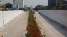 Raidurg station is terminal point of Blue Line,[5] from where Phase 2 airport route will commence.[6] This station was proposed in 2012.[7] Initially, the metro rail was supposed to terminate at Shilparamam but as it was found to be a lake bed,[8] the line was extended by a kilometre to Raidurg where a 15-acre site was earmarked.[9] Raidurg station is opposite Lemon Tree Hotel and TCS Deccan Park. It is 1.6 km from Biodiversity park, Hyderabad.[10] L&T Metro Rail Hyderabad Limited is planning to build Hyderabad's biggest mall (of about one million square feet) near Raidurg metro station.[11][12] Mindspace underpass was constructed as part of Strategic road development plan (SRDP), near which Raidurg metro station is being built.[13]