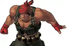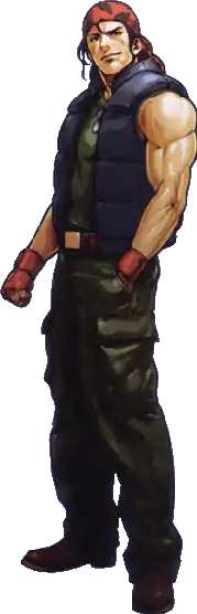 Ralf and Clark would resurface as members of the Ikari Team in The King of Fighters fighting games series, along with their mentor and commanding officer Heidern. The team would be featured as a group of mercenaries who enter the annual King of Fighters tournaments to investigate a possible controversy made by several criminals, such as Rugal Bernstein and the NESTS cartel.[20] Although the Ikari Team has undergone slight roster changes as the series progressed such as the retirement of Heidern, who returned in only with them in The King of Fighters 2001, replaced by his adoptive daughter Leona in The King of Fighters '96 (appearing in all the following games except The King of Fighters XI) as well as the introduction Whip in The King of Fighters '99, Ralf and Clark are two of the few characters who have remained constant, appearing in every game in the series.[21][22][23] He also appears in The King of Fighters XII, which does not feature official teams (however his teammates from the 1996 tournament are all present and in the sequel, Ralf does team with Leona and Clark to form KOF XIII's Ikari team).[24] Ralf has also appeared in the 3D game KOF: Maximum Impact and its sequel. Maximum Impact 2 also features Armor Ralf (アーマーラルフ), an enhanced version from his character with a stronger defense.[25] However, this character was removed from the update version, KOF: Maximum Impact Regulation "A".[26] Other games from the series featuring Ralf are The King of Fighters Neowave and The King of Fighters: Kyo; he appears in both of them with the Ikari Team having Leona as the third member.[27][28]