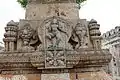 The temple has an imposing tower over the entrance gate (gopura) and two large concentric rectangular enclosures (prakara) around its perimeter. The entrance to the inner sanctum (garbhagriha) is through multiple columned halls (mantapa).[4] A vestibule (sukhanasi), hall (navaranga or just mantapa) and a front hall (mukhamantapa) are the other main structures in the temple. The roof of the mukhamantapa is decorated with a "garland" ("hara") of miniature decorative towers (called "kudu" and "sala" shikharas) whose niches contain stucco images of the god Vishnu.[2]