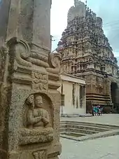 A view of the tower in Vijayanagara style from inside the complex, near the small pushkarni (temple tank)