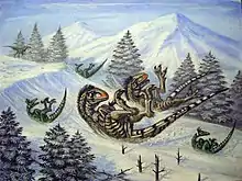 While the Library Journal's review praised Bakker's sympathetic characterization for never becoming cartoonish,[19] other critics felt that the anthropomorphizing of the dinosaurs veered too far into exaggeration.[20] Other criticisms included a lack of character needed for truly engrossing fiction.[21] Reviewers described Bakker's work as genuine, despite flaws such as inconsistent writing.[17][18][22] Billboard praised Megan Gallagher's narration of the audiobook, with its continuous sound effects and dramatic music to creating an "aural picture".[8] Entertainment Weekly gave Raptor Red its "Best of Breed Award" for a "captivating novel about animal life".[23]