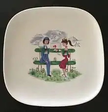 Raymond Peynet (November 16, 1908 – January 14, 1999) was a French cartoonist who was born in Paris and died in Mougins (Alpes-Maritimes). He is known for having created the couple of lovers in 1942 which he represented through a variety of mediums, including ceramics, posters, jewelry, postcards, and postage stamps. In 1987, Raymond Peynet was promoted Commander of the Ordre des Arts et des Lettres.