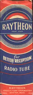 In 1922, two former Tufts University School of Engineering, roommates Laurence K. Marshall and Vannevar Bush, along with scientist Charles G. Smith, founded the American Appliance Company in Cambridge, Massachusetts.[9] Its focus, which was originally on new refrigeration technology, soon shifted to electronics. The company's first product was a gaseous (helium) voltage-regulator tube that was based on Charles Smith's earlier astronomical research of the star Zeta Puppis.[10] The electron tube was christened with the name Raytheon ("light of/from the gods"[11]) and was used in a battery eliminator, a type of radio-receiver power supply that plugged into the power grid in place of large batteries. This made it possible to convert household alternating current to a regulated, high voltage direct current for radios and thus eliminate the need for expensive, short-lived batteries.