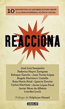 React (from Spanish: Reacciona) is a book by Rosa María Artal published in Spain in 2011 by Aguilar, which compiles articles by José Luis Sampedro, Baltasar Garzón, Federico Mayor Zaragoza, Javier Pérez de Albéniz, Javier López Facal, Carlos Martínez Alonso, Ignacio Escolar, Rosa María Artal, Àngels Martínez Castells, Juan Torres Lopez and Lourdes Lucia. The book, edited by journalist Rosa María Artal, is intended to comment on the political crisis that exists in today's society -particularly in Spain- and the need for a social response to the corruption which led to the financial crisis of 2007–2008. It emphasizes the fact that the concentrations of political powers are becoming increasingly distant from the citizenship.