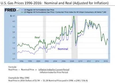 Real values can for example be expressed in constant 1992 dollars, with the price level fixed 100 at the base date.