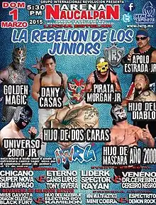 professional wrestling has been a generational tradition in Lucha libre since its inception early in the 20th century, with a great deal of second or third-generation wrestlers following in the footsteps of their fathers or mothers.[2] Several lucha libre promotions honor those traditions, often with annual tournaments such as Consejo Mundial de Lucha Libre's La Copa Junior.[3] The Naucalpan, State of Mexico based International Wrestling Revolution Group (IWRG) created the IWRG Junior de Juniors Championship in 2011, a championship where only second or third-generation wrestlers are allowed to challenge for it. In addition to legitimate second-generation wrestlers there are a number of wrestlers who are presented as second or third-generation wrestlers, normally masked wrestlers promoted as "Juniors". These wrestlers normally pay a royalty or fee for the use of the name, using the name of an established star to get attention from fans and promoters.[2] Examples of such instances of fictional family relationships include Arturo Beristain, also known as El Hijo del Gladiador ("The Son of El Gladiador) who was not related to the original El Gladiador, or El Hijo de Cien Caras who paid Cien Caras for the rights to use the name.[4][5] Weeks after the creation of the Junior de Juniors Championship IWRG held their first IWRG Rebelión de los Juniors show with the centerpiece of the show being the Junior de Juniors Championship. The Rebelión de los Juniors shows, as well as the majority of the IWRG shows in general, are held in "Arena Naucalpan", owned by the promoters of IWRG and their main arena. The 2015 show was the fifth year in a row that IWRG used the Rebelión de los Juniors name for a show