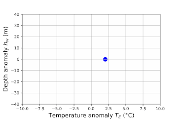 The contribution from the ocean is updated to be that of a reduced-gravity surface layer with an average thickness . Following a similar approach as described above, given the wind stress anomaly and one thermocline depth anomaly (for instance ) it is possible to know the other depth anomaly () through the relation:[12]