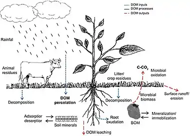 Dissolved organic matter (DOM) is one of the most active and mobile carbon pools and has an important role in global carbon cycling.[41] In addition, dissolved organic carbon (DOC) affects the soil negative electrical charges denitrification process, acid-base reactions in the soil solution, retention and translocation of nutrients (cations), and immobilization of heavy metals and xenobiotics.[42] Soil DOM can be derived from different sources (inputs), such as atmospheric carbon dissolved in rainfall, litter and crop residues, manure, root exudates, and decomposition of soil organic matter (SOM). In the soil, DOM availability depends on its interactions with mineral components (e.g., clays, Fe and Al oxides) modulated by adsorption and desorption processes.[43] It also depends on SOM fractions (e.g., stabilized organic molecules and microbial biomass) by mineralization and immobilization processes. In addition, the intensity of these interactions changes according to soil inherent properties,[44] land use, and crop management.[43][35]