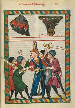The family were ministeriales in the Upper Palatinate in the service of the bishops of Regensburg. They took their name from Brennberg. There were altogether four people with the name "Reinmar von Brennberg." Which of these four was the minnesinger is not altogether clear; however, it is generally believed that the minnesinger refers to Reinmar II von Brennberg, who was documented in 1224-1236 and died between 1271 and 1275. Reinmar II was not murdered, as was depicted in the image from the Codex Manesse, but his son Reinmar III was in 1276.