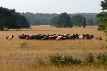 The area's dry and nutrient-poor sandy soil provides a habitat for numerous endangered plants such as the sea thrift, childing pink and wild thyme. The dominant species is sheep fescue. Other rare plants include filago and the hairgrass Corynephorus canescens.[1] The grassland provides nesting for various birds, among them the woodlark, the skylark and the titlark. Leaving the paths is prohibited during the nesting season from April to July,[1] dogs must be kept on a short leash. A herd of Heidschnucken sheep keeps the grass short.[1]