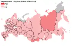 In August 2012 the first large-scale survey and mapping of religions in Russia based on self-identification was published in the Arena Atlas, an extension of the 2010 Census, with data on seventy-nine out of eighty-three of the federal subjects of Russia.[1][2] On a rounded total population of 142,800,000 the survey found that 66,840,000 persons, or 47.4% of the total population, were Christians.[1] Among them, 58,800,000 or 41.1% of the population were believers in the Russian Orthodox Church, 5,900,000 or 4.1% were Christians without any denomination, 2,100,000 or 1.5% were believers in Orthodox Christianity without belonging to any church or (a smaller minority) belonging to non-Russian Orthodox churches (including Armenian and Georgian), 400,000 or 0.2% were Orthodox Old Believers, 300,000 or 0.2% were Protestants, and 140,000 (less than 0.1%) were Catholics.[1] Among the non-Christians, 9,400,000 or 6.5% of the population were Muslims (including Sunni Islam, Shia Islam, and a majority of unaffiliated Muslims), 1,700,000 or 1.2% were Pagans (including Rodnovery, Assianism, and other religions) or Tengrists (Turco-Mongol shamanic religions and new religions), 700,000 or 0.5% were Buddhists (mostly of the Tibetan schools), 140,000 or 0.1% were Hindus (including Krishnaites), and 140,000 were religious Jews.[1] Among the not religious population, 36,000,000 people or 25% declared to "believe in God (or in a higher power)" but to "not profess any particular religion", 18,600,000 or 13% were atheists, and 7,900,000 or 5.5% did not state any religious, spiritual or atheist belief.[1]