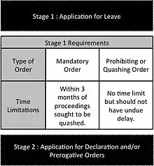 Should leave be granted, the applicant can proceed to the second stage which is the actual application for one or more of the prerogative orders.[53]