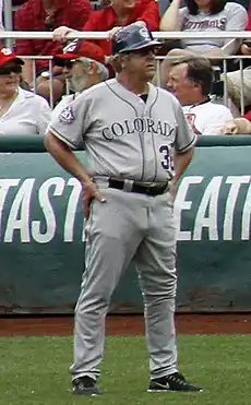 ![]() Lachemann as a first base coach for the Colorado Rockies in 2013 | |