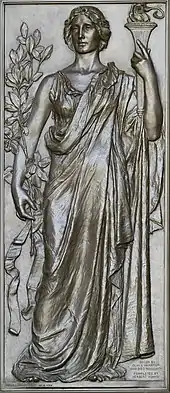 Basrelief sculpture "Research holding the torch of knowledge" (1896) by Olin Levi Warner. Library of Congress, Thomas Jefferson Building, in Washington, D.C.
