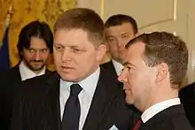 After coming to power in 2006, Fico declared that Slovakia's relations with Russia would improve after eight years of "neglect." Fico referred to "Slavonic solidarity," which was a central theme of the Slovak National Awakening in the 1850s. On April 4, 2008, during a visit by Russian Prime Minister Viktor Zubkov, Fico said: "In Slovakia, there have been efforts to deliberately ignore Slavonic solidarity."[56] Slovakia modernised Russian MiG fighters in Russia and did not buy new jets from the West.[57] Additionally, Fico accused Georgia of provoking Russia when attacking South Ossetia in the 2008 Russia–Georgia war.[58] Under his premiership, the Slovak foreign ministry rejected the Crimean referendum which incorporated Crimea into Russia. Fico himself, however, remained silent on the issue.[59] Regarding the EU sanctions against Russia in 2014, Fico denounced them as "senseless," and a "threat to the Slovak economy."[60]