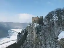 Reussenstein Castle (Ruine Reußenstein: the Reussenstein Ruin) is ruins of a medieval fortress in Germany. It is situated 760 metres (2,490 ft) above sea level overlooking Neidlingen in Baden-Württemberg, Germany.