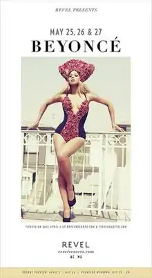 Tickets for the concerts were made available on April 6, 2012, 10 a.m. EST through Ticketmaster after an exclusive pre-sale one day earlier on Beyonce.com, Beyoncé's official website.[40][41][42] Within one minute, all three shows were sold out. On May 7, 2012, an additional concert was scheduled for May 28, 2012 because of high demand. Tickets were sold in a similar fashion, with an exclusive pre-sale on Beyonce.com and a Ticketmaster general sale taking place on May 11, 2012, 10 a.m. EST and May 14, 10 a.m. EST respectively.[43][44] The fourth date would eventually sell-out as well.[14] Listed for sale at $95 – $495, ticket prices took a hike up to $1,700 through ticket resale companies like StubHub.[45] According to Jim Farber of Daily News, the tickets were sold for high prices because the Revel Presents: Beyoncé Live was the only show by Beyoncé announced that year.[45]