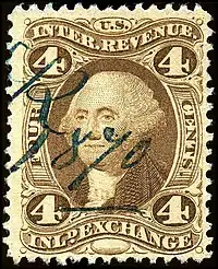 The first revenue stamps in the United States were used briefly during colonial times, among the most notable usage involved the Stamp Act. Long after independence, the first revenue stamps printed by the United States government were issued in the midst of the American Civil War, prompted by the urgent need to raise revenue to pay for the great costs it incurred. After the war ended however, revenue stamps and the taxes they represented still continued. Revenue stamps served to pay tax duties on items that came under two main categories, Proprietary and Documentary. Proprietary stamps paid tax duties on goods like alcohol and tobacco, and were also used for various services, while Documentary stamps paid duties on legal documents, mortgage deeds, stocks and a fair number of other legal dealings. Proprietary and Documentary stamps often bore these respective designations, while in several of the issues they shared the same designs, sometimes with minor variations. Beginning in 1862 the first revenue stamps were issued, and would continue to be used for another hundred years and more. For the first twelve years George Washington was the only subject featured on U.S. revenue stamps, when in 1875 an allegorical figure of Liberty finally appeared. Revenue stamps were printed in many varieties and denominations and are widely sought after by collectors and historians. Revenue stamps were finally discontinued on December 31, 1967.