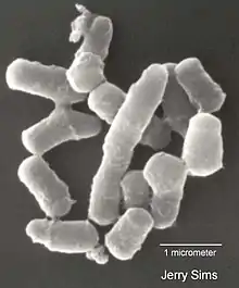 Rhodococcus is a genus of aerobic, nonsporulating, nonmotile Gram-positive bacteria closely related to Mycobacterium and Corynebacterium.[1][2] While a few species are pathogenic, most are benign, and have been found to thrive in a broad range of environments, including soil, water, and eukaryotic cells. Some species have large genomes, including the 9.7 megabasepair genome (67% G/C) of Rhodococcus sp. RHA1.[3]