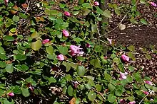 Growing to 1.5 m (4.9 ft) tall and broad, it is a compact evergreen shrub with rounded matt green leaves and rose pink bell-shaped flowers in spring.