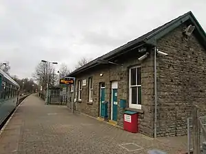 Rhymney railway station serves the town of Rhymney in Wales. Situated on the Valley Lines network 23 miles (37 km) north of Cardiff Central, it is the terminus of the Rhymney Line. The station has sidings to the west of its single platform which are used for the overnight stabling of the diesel multiple unit trains