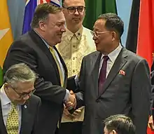 In August 2017, amid heightened tensions on the Korean Peninsula, Ri took part in a rare multilateral meeting with foreign ministers at a summit meeting in Manila, Philippines. Ri negotiated with his South Korean, Chinese, and Russian counterparts, making the meeting only two parties – the United States and Japan – short of the makeup of the six-party talks.[17] On 7 August, Ri said that his country will never negotiate away North Korea's nuclear weapons.[18]