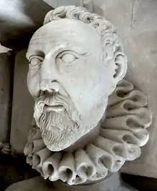 Richard Bampfield's monument, erected in 1604 by his son Amias Bampfield, survives in the south transept of Poltimore Church. It comprises two recumbent stone effigies, of Richard Bampfield and his wife, under a low canopy supported by arched openings and columns.[16] A view of the monument is obstructed by pews in front and by the balcony above forming the manorial pew of the Bampfield family. The 8 painted escutcheons on the cornice depict the arms of 5 of his 8 sons-in-law, each impaling Bampfield, and the 3 sons-in-law of his son and heir Sir Amias Bampfylde, each impaling Bampfield.