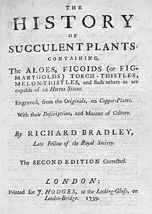 Little is known about Bradley's childhood aside from an early interest in gardening and the fact that he lived in the vicinity of London, a city at the time with many amateur naturalists.[1] Though Bradley lacked a university education, his first publication, Treatise of Succulent Plants, gained him traction with influential patrons like James Petiver and later, Hans Sloane.[2] With their support, he was proposed and elected a Fellow of the Royal Society in 1712, at the age of 24.