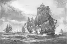 On 2 June 1784, still serving under his cousin, Byron was promoted to midshipman of HMS Druid, searching for smugglers along the Devon and Cornish coast.[1] Byron served for a while under Druid's next captain, Joseph Ellison, who joined the ship in March 1785, then in November 1788, Byron rejoined his cousin who was at that time in command of the 36-gun Phoenix. Phoenix sailed for the East Indies where she took part in actions against Tippoo Sahib. During the campaign, the boat carrying George Byron overturned and, severely injured, he was sent home to England, where he later died. Richard Byron, who had been serving as master's mate, then transferred to HMS Crown, under the flag of Rear-admiral William Cornwallis, as a midshipman once more. Cornwallis later moved his flag to Minerva and was soon after followed by Byron. On 1 October 1792, Byron was promoted to lieutenant of the 36-gun HMS Perseverance.[1] When Perseverance returned to home waters in July the following year, Byron was on leave until he was appointed to Rear-admiral Caldwell's flagship, Impregnable in October 1793. Byron was aboard Impregnable when she fought in a fleet action on 1 June 1794.