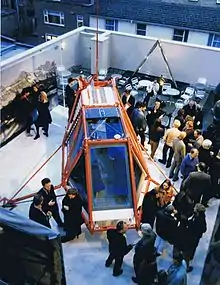 Ski Haus was conceived while skiing late and high in the Alps: evening sun, a beautiful, clear, starlit night, twinkling lights of the village in the valley, a reluctance to return: Would it be possible to stay here in the beautiful, cold silence? The SkiHaus serves as a mobile alpine hut or a ‘hard tent’. The lightweight, all-aluminium structure weighs only 315 kg and is designed to be lifted into position by helicopter. It is well-insulated using lightweight aviation materials and has a self-sufficient energy system powered by solar and wind generators. Since 1992 the SkiHaus has been tested by the team together with mountain guides and helicopter engineers at varying altitudes in the Swiss Alps up to 3901m (next to the ‘Kleines Matterhorn’). It will be used further by the local mountain guide centres for ski touring, climbing, guide training, ski races and medical positions. Besides its rescue and safety functions, the SkiHaus is an architectural vehicle with which to explore the third dimension and the wide clear spaces on top of the mountains. It has been situated on the Swiss-Italian ridge close to the ‘Kleines Matterhorn" since May 2004 and is currently used as shelter and accommodation for skiers and climbers.[3]