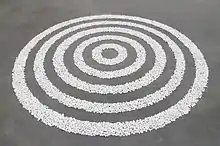 His piece Delabole Slate Circle, acquired from the Tate Modern in 1997, is a central piece in Bristol City Museum and Art Gallery. The piece is nearly 2 metres in diameter and is composed of 168 pieces of slate that came from the Delabole quarry in Cornwall, United Kingdom. The piece can be configured differently, however Long has specified a few rules on how it should be put together. All pieces of stone must touch so that they can be locked together and stable, as well as the pieces must form a circle. The connection of the slates and the geometric shape illustrates a common theme that Long portrays in his work about the relationship between man and nature. Long explains, "you could say that my work is ... a balance between the patterns of nature and formalism of human, abstract ideas of lines and circles. It is where my human characteristics meet the natural forces and patterns of the world, and that is really the kind of subject of my work."[7]