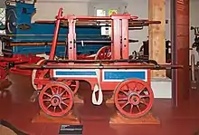 Richard Newsham (died 1743) was an English inventor. He took out two patents for fire engines in 1721 and 1725 (Royal Patent Office 1721 patent #439 and 1725 patent #479) and soon dominated the fire engine market in England.[1] The engine had two single-acting pistons and an air vessel placed in a tank which formed the frame of the machine. The pump was worked by people at the long cross handles. At the front of the engine, protected by a sheet of horn and a door, were directions for keeping the machine in order.[2] The cistern could hold about 170 US gallons (640 L) of water pumping up to 100 US gallons (380 L) a minute.[3] New York City imported its first two fire engines from Newsham in 1731.[4] In 1737 Newsham made a manual fire pump for the Parish of Bray in Berkshire.