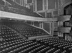 The rear (east) end of the orchestra contains a promenade with decorative bands on its ceiling.[28] The orchestra is raked, but its rear rows contain stadium seating that is more steeply sloped than the front rows.[18][29][8] While the front rows are at ground level, the rearmost level is almost one story higher,[29][30][31] allowing the entrance foyer to be placed under the rear of the orchestra.[15][30] This stadium seating configuration was supposedly used to improve visibility and acoustics,[18][26][29] though the rear rows have poor visibility as a result of the steep slope.[15][31] There is a double staircase to the balcony level from the center of the orchestra's rear section.[28] A partial cross-aisle and a wrought-iron railing separate the orchestra's front and rear portions.[32] There are exit doors from the partial wide aisles.[18][28] Two aisles lead from the orchestra's front to the rear, connecting with the exit doors.[18] The orchestra and its promenade contain walls with plasterwork paneling. There are arches along the orchestra's side walls, which contain shallow pilasters and moldings.[33][15]