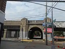 In 1911, New York City and the Long Island Rail Road began negotiating the elimination of numerous at-grade crossings within Queens.[5][6] In 1917, the LIRR finalized the grade crossing elimination project plans for the Montauk Branch in the Richmond Hill area, which would construct a new elevated station between Park Street (today's Hillside Avenue) and Lefferts Avenue (now Lefferts Boulevard).[7] During the project, the wooden station was temporarily relocated.[6] The current station opened in 1923.[1] The project eliminated numerous at-grade crossings in the vicinity of the station, including those at St. Anne Avenue (now 84th Avenue), Ashland Avenue (now 85th Avenue), Park Street, the intersection of Jamaica and Lefferts Avenue, and Ridgewood Avenue (now 89th Avenue). It also extended the roads adjacent to the right-of-way then known as Railroad Avenue (now Babbage Street and Bessemer Street) east to Lefferts Avenue.[5][7][8]