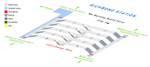 Richmond has ten platforms; five island platforms with ten faces. It is built on an embankment immediately east of Punt Road, with platforms extending west across the Punt Road railway bridge. The station is connected by three subways, with access to the platforms by ramps. There are no lifts at the station.