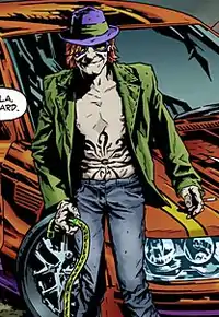 Riddler eventually formed his team, consisting of himself, Poison Ivy, Scarecrow, Deathstroke, Clayface, Killer Croc, Two-Face, Firefly, and Victor Zsasz.[18] Waging war on Joker's team across Gotham, Riddler is responsible for poisoning Charles Brown's son, resulting in his transformation into Kite Man who joins up with Joker's team consisting of Cluemaster, Deadshot, Mad Hatter, Man-Bat, Mr. Freeze, Penguin, Solomon Grundy, and Ventriloquist.[19] The war continues, with Riddler and Joker claiming territories across Gotham, before Riddler, who had convinced Batman to side with him during the conflict, blackmails and interrogates Kite Man into giving up Joker's location. However Batman, after a brief fight between him, Riddler and Joker, becomes disgusted by Riddler's actions and quickly grabs a blade, breaking his one rule of no killing in order to stab Riddler. However, Joker, who finally begins to laugh again, prevents Batman from doing so.