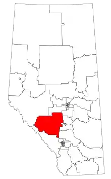 | Drayton Valley-Devon and West Yellowhead | Innisfail-Sylvan Lake, Lacombe-Ponoka, and Olds-Didsbury-Three Hills | British Columbia boundary | Banff-Cochrane |