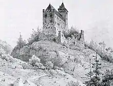 The original castle consisted of a slender, tall bergfried and an attached two-story palas. Not long after, a third story was added to the palas.[3] These buildings were surrounded with a ring wall. The gatehouse was demolished in the past few centuries and no trace of it remains.[4]