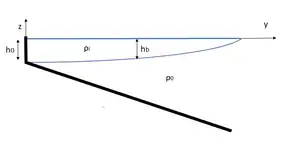 Bottom-advected plumes are often characterized by large discharge conditions and are generally less sensitive to wind forcing and corresponding advection and mixing.[6] This type of advection is driven by bottom Ekman transport, which drives the fresh or brackish river outflow with density and velocity from an estuary of width and depth to the frontal zone across the shelf. This is indicated in the figure to the right. When the frontal zone is far enough from the shore, thermal wind dynamics can transport the complete volume flux away from the estuary. The across-shore position , which denotes the width of the coastal current, and the equilibrium-depth at which the plume separates from the bottom can be calculated in equilibrium conditions with a certain bottom slope by
