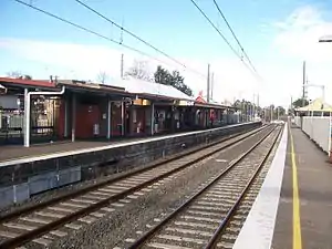 The station building on Platform 1 is composed of a number of buildings. The first is a single storey, c. 1880s face brick symmetrical building with two flanking, parapeted wings, which includes a central waiting room with office on one side and the former ladies waiting room on the other, connecting to toilets in the eastern wing. The western wing is the former lamp room. The wings are linked to the main building by small, flat roofed rooms. The roadside elevation is fronted by an ogee profile timber and iron framed verandah between two projecting wings, while on the rail side there is a cast iron fluted column and metal framed awning with decorative brackets. The roadside faces the motor traffic forecourt which swings around the war memorial. Connected to the eastern end of the main building is a brick building under the same flat roof as the more modern shops that face the road behind it. This is linked to the previously free standing, original ticket office.[2]