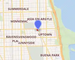 Built in 1917, it was designed by Rapp and Rapp for the Balaban & Katz theatre chain run by A. J. Balaban, his brother Barney Balaban and their partner and brother-in-law, Sam Katz.[2] It is an example of French Renaissance Revival architecture.[3] It later became a private nightclub in 1986. The theatre is located in the Uptown section of the city, at the intersection of Lawrence, Broadway and Racine. The area has several notable theaters, including the Aragon Ballroom, which is only 0.2 miles away. Since 2006 it has been owned by Chicago-based Jam Productions (itself owned by Jerry Mickelson and Arny Granat), which claims to be the "largest independent producer of live entertainment in the United States".[4][5][6]