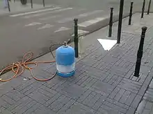 Preformed thermoplastic pavement markings (sometime called "tape", but not to be confused with preformed polymer tape) are thermoplastic cut into the final shapes by the manufacturers and ready to position onto an asphalt or concrete pavement surface. Preformed thermoplastics are put into place on the road surface and applied using a propane heat torch. Some models require heating the road surface prior to the placement of the preformed thermoplastics. These markings are used primarily because of their durability and cost-effective service life. Since the plastics are melted into the surface, they are not easily damaged by snowplows. Typically, the preformed thermoplastic markings can last 3 to 6 years. The most common applications of preformed thermoplastic pavement markings are found at intersections as transverse markings such as stop lines, legends, crosswalks, arrows, bike lane symbols, and accessibility symbols.[10][12]