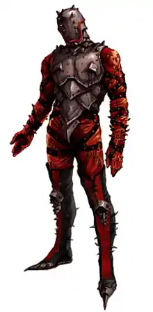 After the events of Stamford, Baldwin believed his powers to be burned out.[65] However, they still exist, but now only manifest when he feels pain.[30] While his powers are still kinetically based, they no longer appear to manifest as a "bubble field"; rather, his powers seem far more explosive in nature. In order to stimulate his powers, his Penance suit constantly rakes his flesh. Baldwin tolerates this to a masochistic degree, once stating that he would "wear [the suit] all the time if I could."[66] By wearing the suit he has developed a natural tolerance to pain. His suit consists of 612 spikes facing inward, each to represent a person who lost their life in Stamford. 60 of the spikes are longer than the rest, one for each of the children.