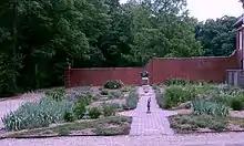 The oldest garden on the Allerton Estate, the Brick Walled Garden was constructed in 1902 and is characterized by its tall, red-brick walls. It was originally a vegetable garden with bean trellises and a dipping pool in the center for irrigation. In the 1940s the plantings were changed to grassy quadrants bordered with hedges.[17] The pool was replaced by the present center feature, the Girl with the Scarf sculpture.[15] The sculpture, a white concrete figure by Lili Auer (1904- ), was added to the garden in 1942.[18]