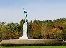 The sculpture walk concludes with The Sun Singer, a copy of an Art Moderne bronze sculpted by Swedish artist Carl Milles (1875-1955) in 1919 to stand overlooking the harbor in Stockholm.[31] Robert Allerton commissioned a reduced size copy in 1929, but the artist sent a 16-foot full−size casting instead. After the statue arrived John Gregg Allerton designed a three−tiered platform styled after the Altar of Heaven in the Forbidden City of Beijing as a base in 1932.