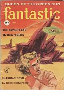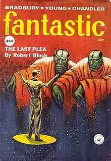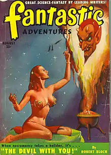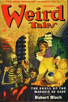 During the 1930s, Bloch was an avid reader of the pulp magazine Weird Tales, which he had discovered at the age of ten in 1927. In the Chicago Northwestern Railroad depot with his parents and aunt Lil, his aunt offered to buy him any magazine he wanted and he picked Weird Tales (Aug 1927 issue) off the newsstand over her shocked protest.[7][8][9] He began his readings of the magazine with the first instalment of Otis Adelbert Kline's "The Bride of Osiris" which dealt with a secret Egyptian city called Karneter located beneath Bloch's birth city of Chicago.[10] The Depression came in the early 1930s. He later recalled, in accepting the Lifetime Achievement Award at the First World Fantasy Convention (1975), how "times were very hard. Weird Tales cost twenty-five cents in a day when most pulp magazines cost a dime. I remember that meant a lot to me." He went on to relate how he would get up very early on the last day of the month, with twenty-five cents saved from his monthly allowance of one dollar, and would run all the way to a combination tobacco/magazine store and buy the new Weird Tales issue, sometimes smuggling it home under his coat if the cover was particularly risqué.[11] His parents were not impressed with Hugh Doak Rankin's sexy covers for the magazine, and when the Bloch family moved to Milwaukee in 1928 young Bloch gradually abandoned his interest. But by the time he had entered high school, he returned to reading Weird Tales during convalescence from flu.[7]