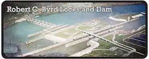The Robert C. Byrd Lock and Dam, formerly the Gallipolis Lock and Dam, is the 10th lock and dam on the Ohio River, located 280 miles downstream from Pittsburgh. There are 4 locks: one for commercial barge traffic, 1,200 feet long by 110 feet wide; the auxiliary lock is 600 feet long by 110 feet wide; and there are 2 smaller parallel locks.[1]